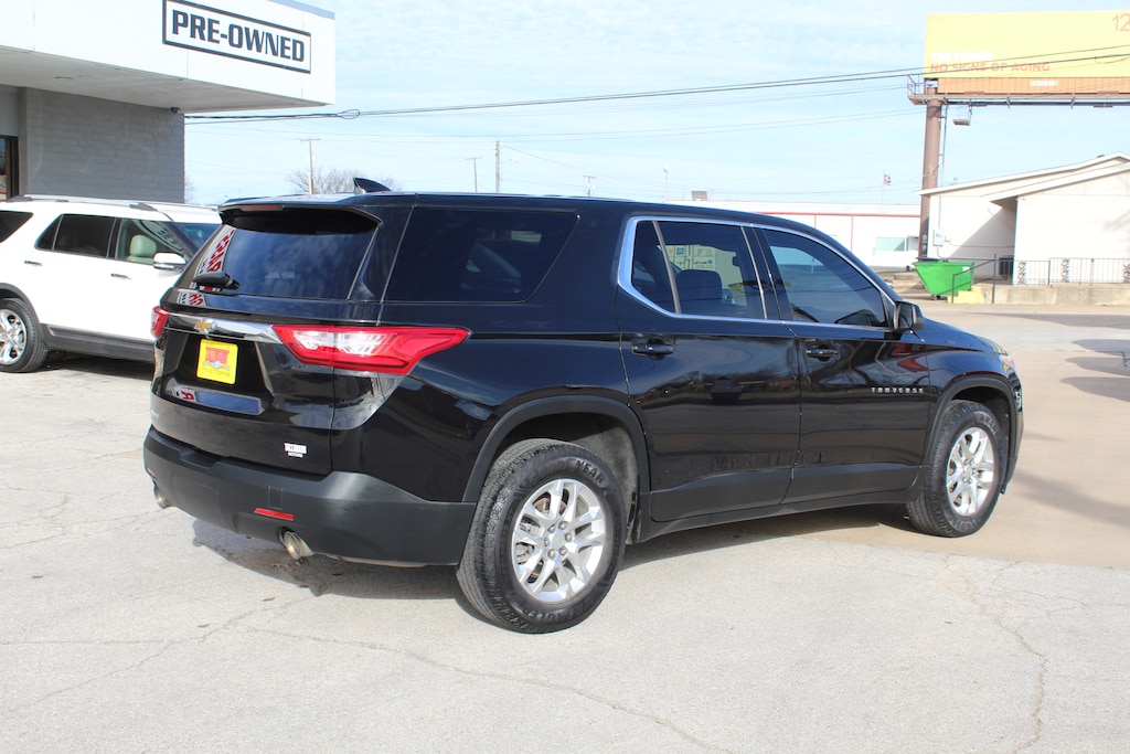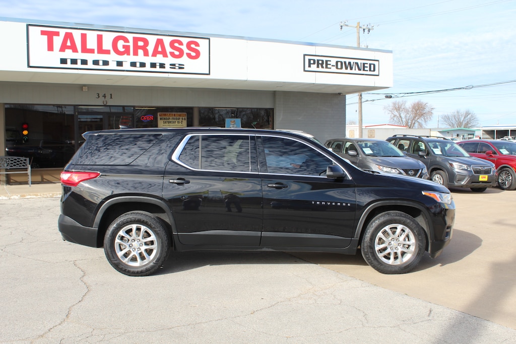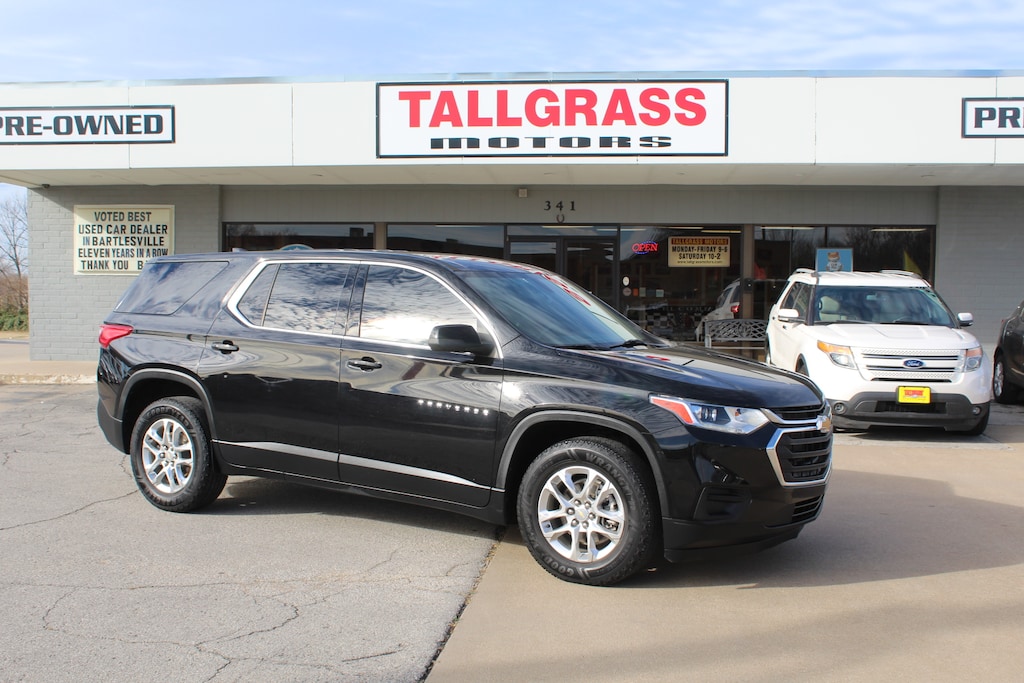 2021 CHEVY TRAVERSE LS, 107,455 MILES, 3.6L V6 ENGINE, CLOTH INTERIOR, BLUETOOTH, APPLE CARPLAY, ANDROID AUTO, KEYLESS START, SEATING FOR 8, THIRD ROW SEATING, REAR VISION CAMERA, AUTO CLIMATE CONTROL, REAR HEAT AND AIR, ONE OWNER, CLEAN CARFAX.